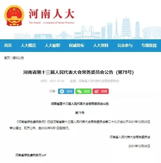 《河南省綠色建筑條例》已經(jīng)河南省第十三屆人民代表大會常務(wù)委員會第二十九次會議于2021年12月28日審議通過,現(xiàn)予公布,自2022年3月1日起施行。