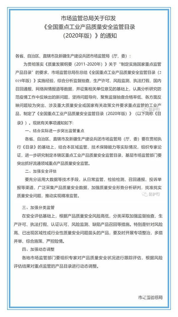 近日,市場監(jiān)管總局對《全國重點(diǎn)工業(yè)產(chǎn)品質(zhì)量安全監(jiān)管目錄(2019年版)》實(shí)施經(jīng)驗(yàn)進(jìn)行總結(jié),綜合分析數(shù)據(jù),結(jié)合實(shí)際情況,征集相關(guān)單位意見,制定了《全國重點(diǎn)工業(yè)產(chǎn)品質(zhì)量安全監(jiān)管目錄(2020年版)》。