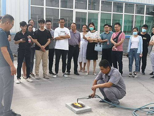 在車間外,我司工作人員現(xiàn)場(chǎng)演示了無機(jī)塑化微孔保溫板的吸水性、防火性、熱工性能等特點(diǎn),引起設(shè)計(jì)院專家的嘖嘖稱贊。