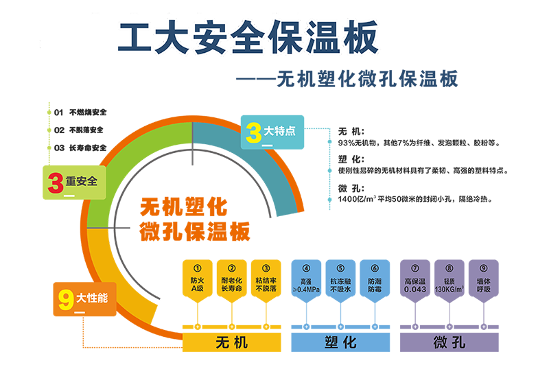 無機塑化微孔保溫板密度約130kg/m3,抗壓強度≥0.40MPa,解決了保溫材料”低密度和高強度難于一身“的技術難題。